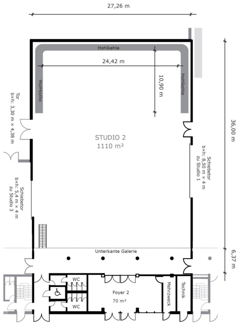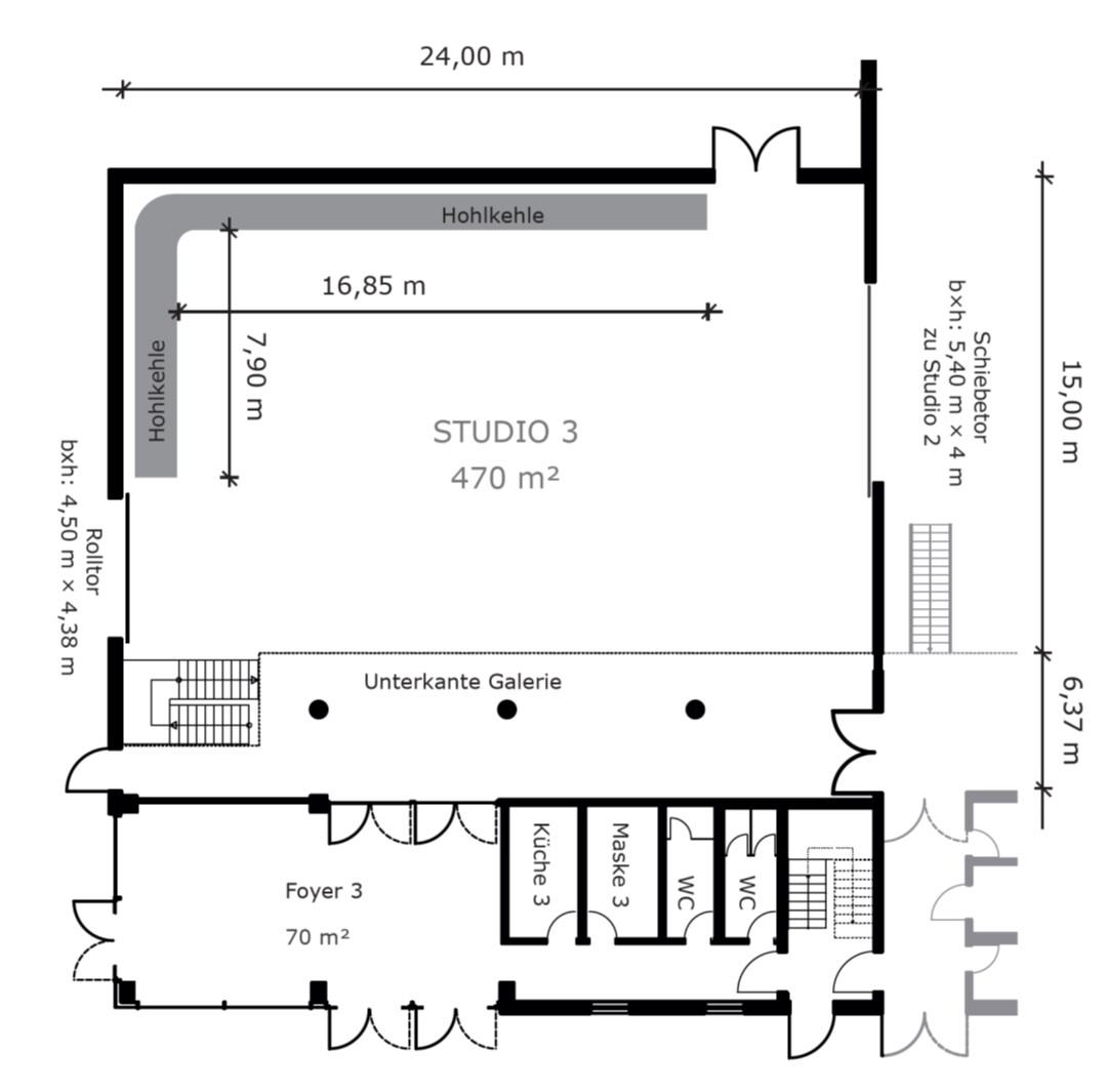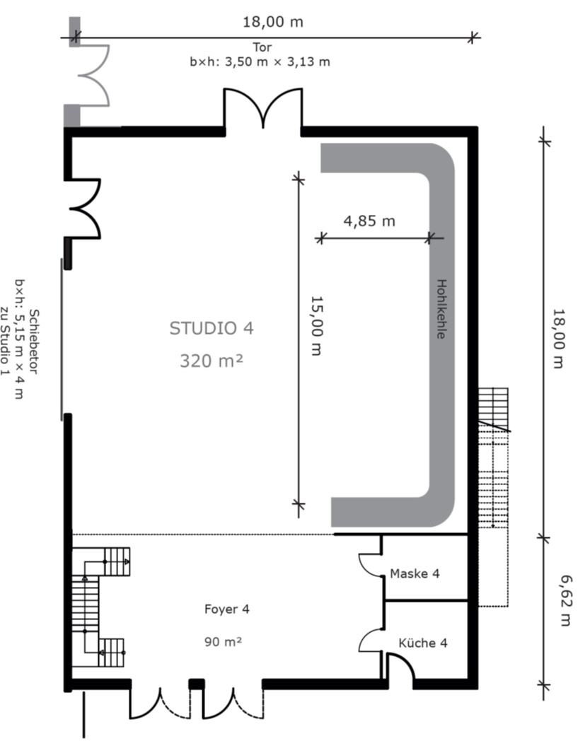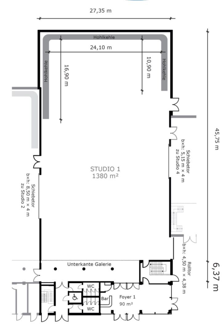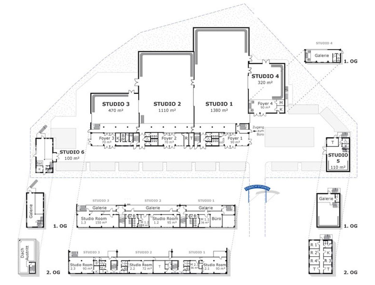 Four studios form the main complex of this outstanding location. They individually offer areas between 320 and almost 1.400 sqm. However, the opening of large intermediate gates also creates a total network of more than 3.500 sqm . Access by truck is very easy, as all studios are at ground level.